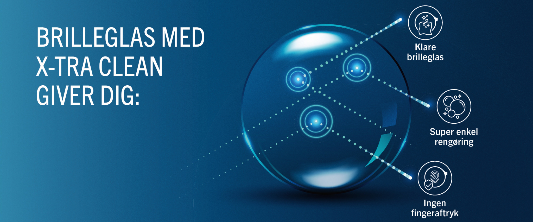 Ønsker du brilleglas, der holder sig rene fra morgen til aften? Med den avancerede X-tra Clean overfladebehandling får du en ultrajævn glasstruktur, der gør det markant sværere for snavs at binde sig. Skulle der alligevel komme lidt på, kan det fjernes på få sekunder.